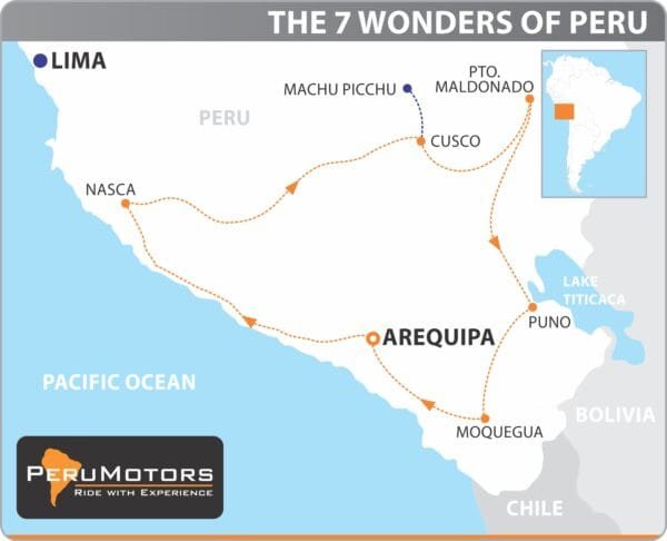 Vanaf de start in de prachtige koloniale stad Arequipa (UNESCO) is deze tour een aaneenschakeling van hoogtepunten. De (meestal) verharde wegen zijn gewoon spectaculair. Absoluut hoogtepunt is natuurlijk de verloren Inca-stad Machu Picchu. Een ander hoogtepunt is het verblijf van 2 nachten in een Amazone Jungle lodge. Als je Peru wilt leren kennen, dan is dit jouw motortour. Onze professionele meertalige gids brengt je naar de bekende plekken, maar vergeet ook de minder bekende knikkers niet. Dit is waar avontuurlijk motorrijden over gaat!