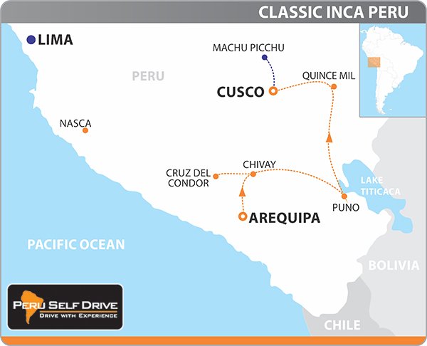 PeruMotors offers you a guided self drive tour in Peru in an absolute minimum of time (9 days). The tour starts in our hometown: Arequipa. You can see the Andean Condors in flight in the Colca Canyon, you’ll visit the ‘Floating islands of the Uros’ on lake Titicaca, feel just a touch of the Amazon jungle, see the ‘Sacred Valley of the Incas’, and, of course, THE touristic highlight of South America: MACHU PICCHU.